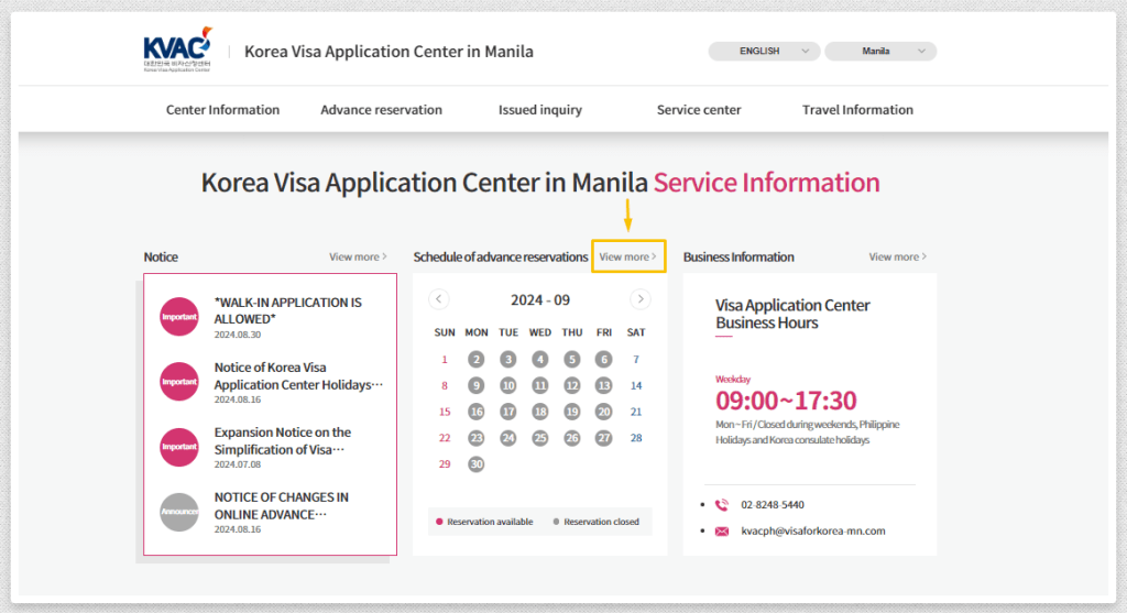 Scroll down the homepage until you reach the calendar section labeled “Schedule of Advanced Reservation.” Click the “View More” button to expand the calendar and access the reservation scheduling options.